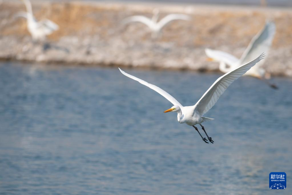 Egrets are seen at Fenhe river wetland park in Taiyuan, north China's Shanxi Province, Dec. 28, 2021. (Xinhua/Yang Chenguang)