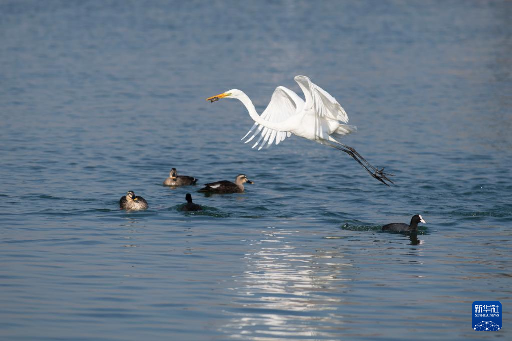 An egret forages at Fenhe river wetland park in Taiyuan, north China's Shanxi Province, Dec. 28, 2021. (Xinhua/Yang Chenguang)