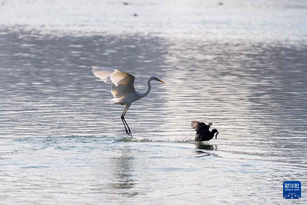 An egret is seen at Fenhe river wetland park in Taiyuan, north China's Shanxi Province, Dec. 28, 2021. (Xinhua/Yang Chenguang)
