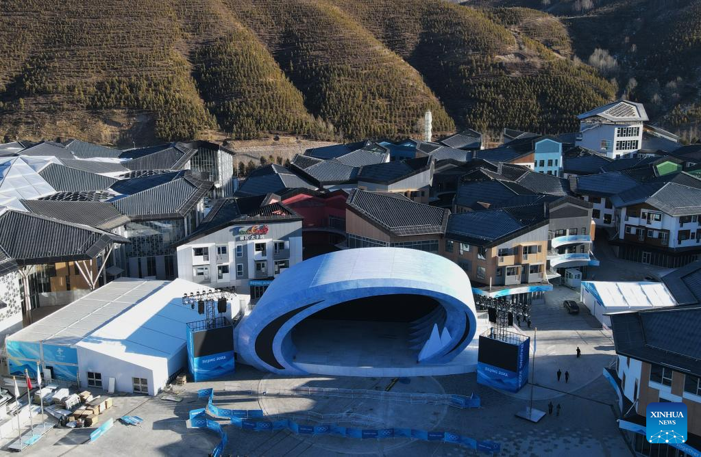 Aerial photo taken on Dec. 28, 2021 shows the stage for the awarding ceremony at Zhangjiakou competition zone of the Beijing 2022 Olympic and Paralympic Winter Games, in Zhangjiakou, north China's Hebei Province. (Xinhua/Yang Shiyao)
