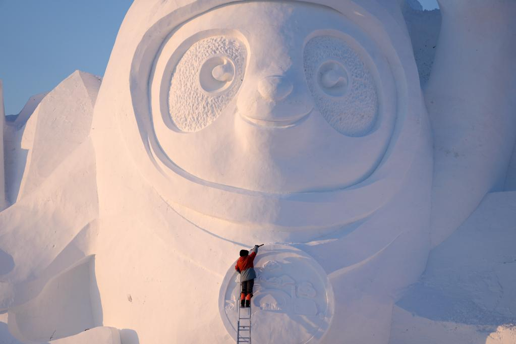 Workers finish main snow sculpture featuring Beijing 2022 mascots in Harbin (2)