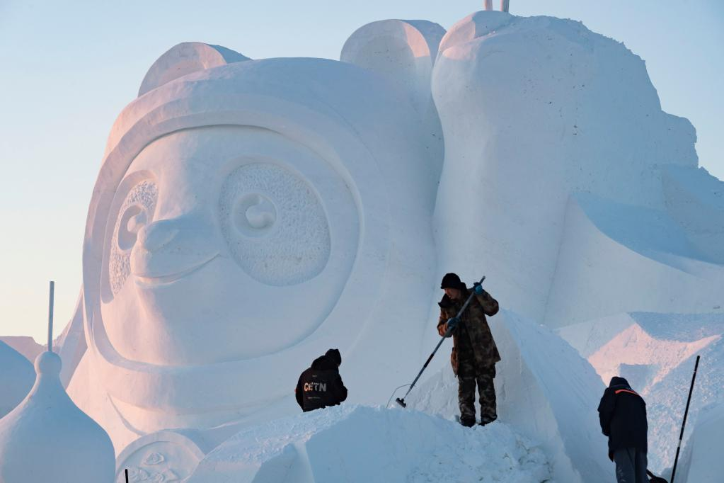 Workers finish main snow sculpture featuring Beijing 2022 mascots in Harbin