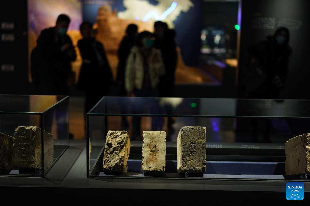 Photo taken on Dec. 28, 2021 shows city wall bricks displayed at the exhibition hall of the city wall museum of Nanjing in Nanjing, capital of east China's Jiangsu Province. The Nanjing city wall museum opened for trial service here Tuesday. It will showcase the historic and cultural value of the Nanjing city wall from various aspects. (Xinhua/Ji Chunpeng)