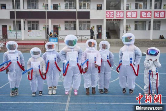 Photo shows young children dressed in “space suits” at a primary school located deep in the mountains of southwest China’s Sichuan Province. (Photo/Han Xian)