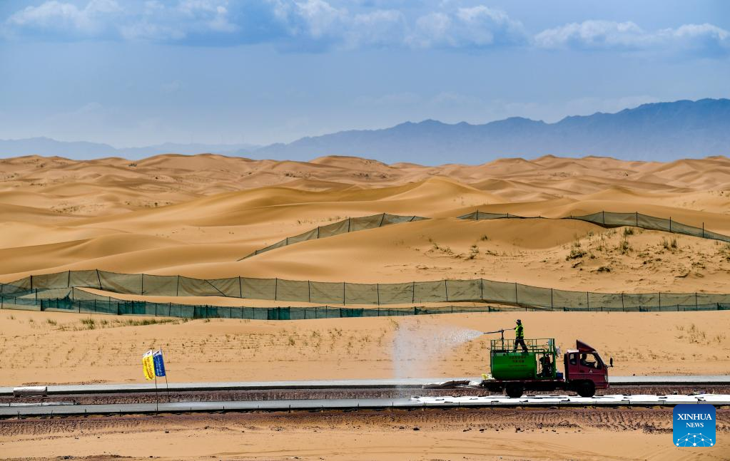 The Qingtongxia-Zhongwei section in Ningxia of the Wuhai-Maqin expressway, linking Wuhai in Inner Mongolia Autonomous Region and Maqin County in Qinghai Province, fully opened to traffic Wednesday. The 122.99-kilometer-long section, of which an 18 kilometers section goes through the hinterland of Tengger Desert, is the first desert expressway built in Ningxia. (Xinhua/Feng Kaihua)