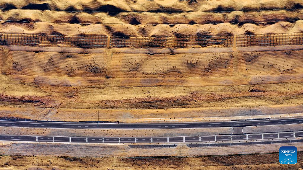 The Qingtongxia-Zhongwei section in Ningxia of the Wuhai-Maqin expressway, linking Wuhai in Inner Mongolia Autonomous Region and Maqin County in Qinghai Province, fully opened to traffic Wednesday. The 122.99-kilometer-long section, of which an 18 kilometers section goes through the hinterland of Tengger Desert, is the first desert expressway built in Ningxia. (Xinhua/Feng Kaihua)