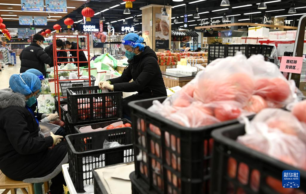 Staff members arrange packed vegetables to be delivered to households under closed-off management, at a supermarket in Xi'an, capital of northwest China's Shaanxi Province, Dec. 29, 2021.