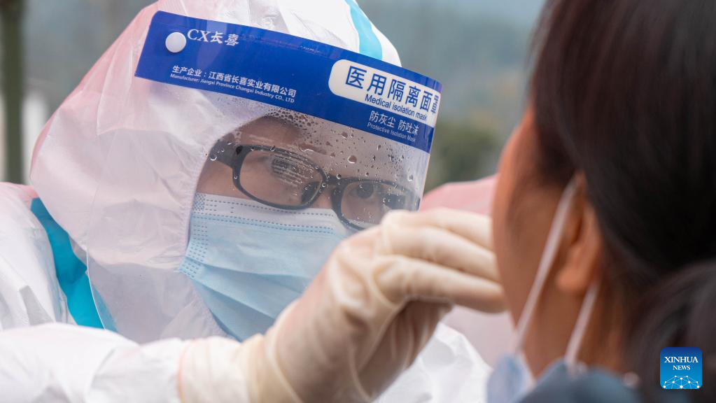 A medical worker collects a swab sample from a resident at a COVID-19 testing site in Tongren City, southwest China's Guizhou Province, Dec. 29, 2021. (Photo by Ye Shunqiang/Xinhua)