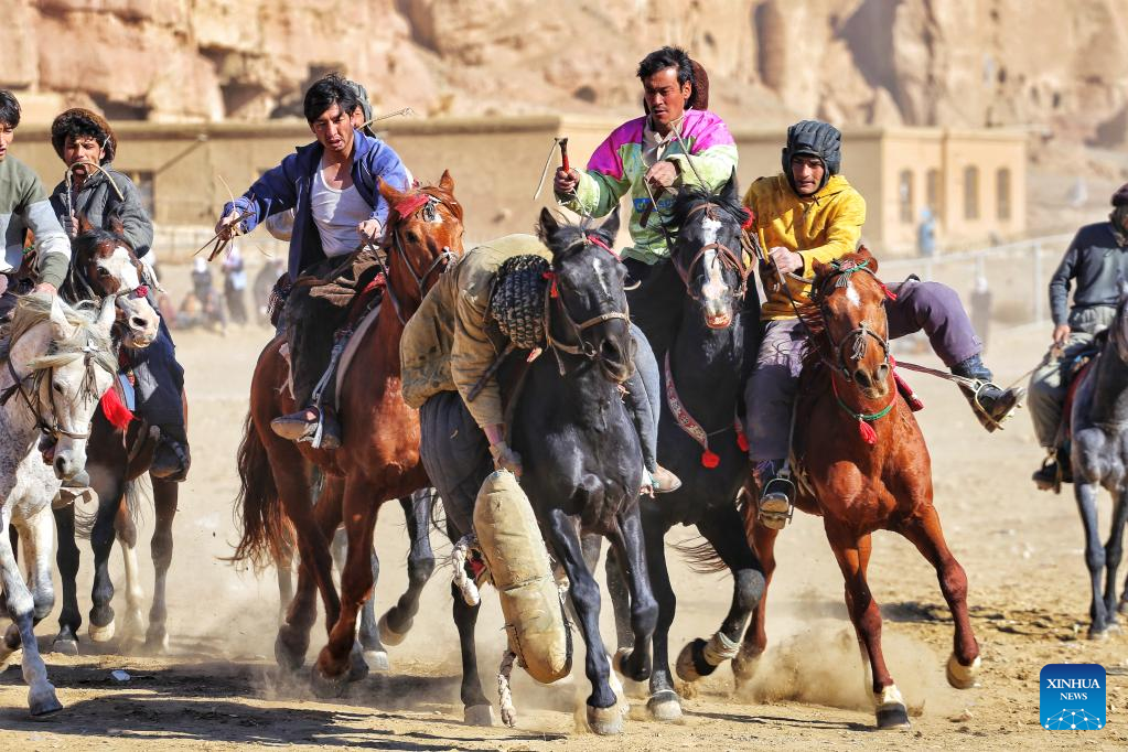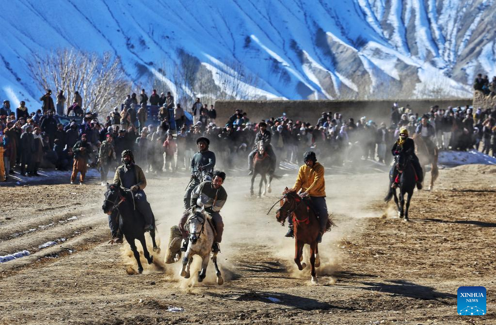 Horse riders compete during a game of Buzkashi, or "goat grabbing" in English, in Bamiyan, Afghanistan, Dec. 28, 2021. (Photo by Ahmadi/Xinhua)