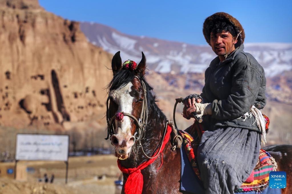 A horse rider poses for photos during a game of Buzkashi, or "goat grabbing" in English, in Bamiyan, Afghanistan, Dec. 28, 2021. (Photo by Ahmadi/Xinhua)