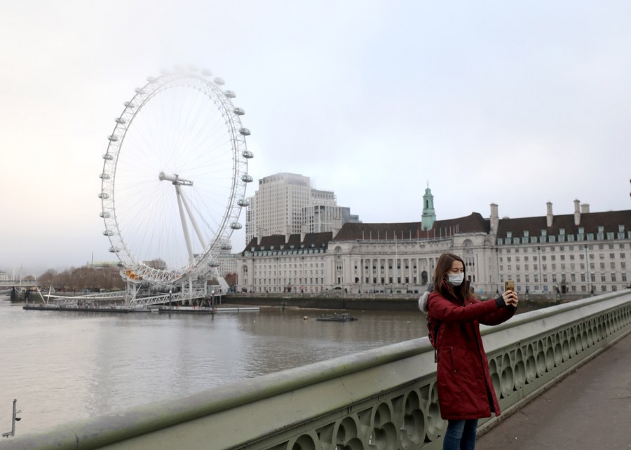 A woman wearing a face mask takes selfies in London, Britain, Dec. 19, 2021. (Xinhua/Li Ying)