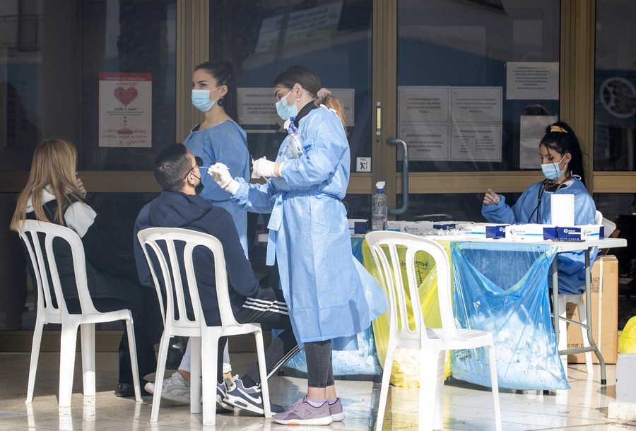 A medical worker takes a swab from a man for a COVID-19 rapid test in Nicosia, Cyprus, on Dec. 29, 2021. (Photo by George Christophorou/Xinhua)