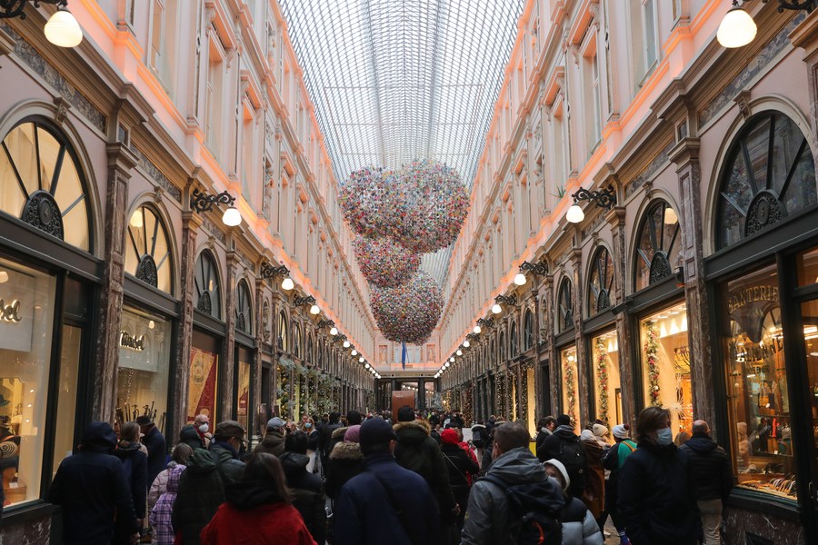People do shopping at the Royal Gallery of Saint Hubert in Brussels, Belgium, on Dec. 27, 2021. (Xinhua/Zheng Huansong)