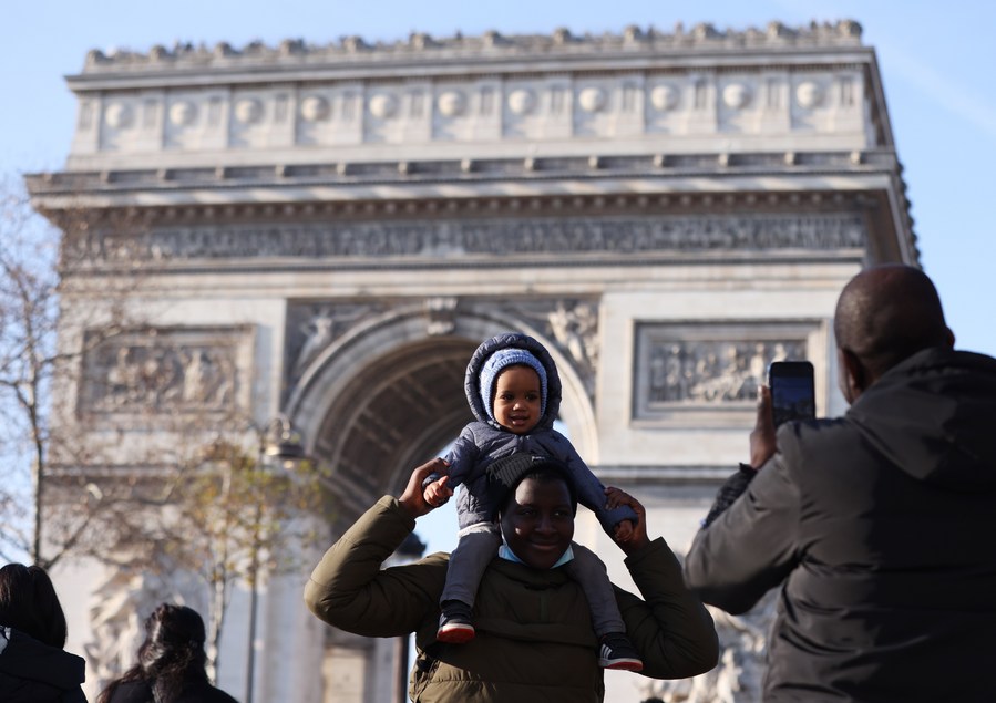 People take souvenir photos in front of the Arc de Triomphe in Paris, France, Dec. 23, 2021. (Xinhua/Gao Jing)