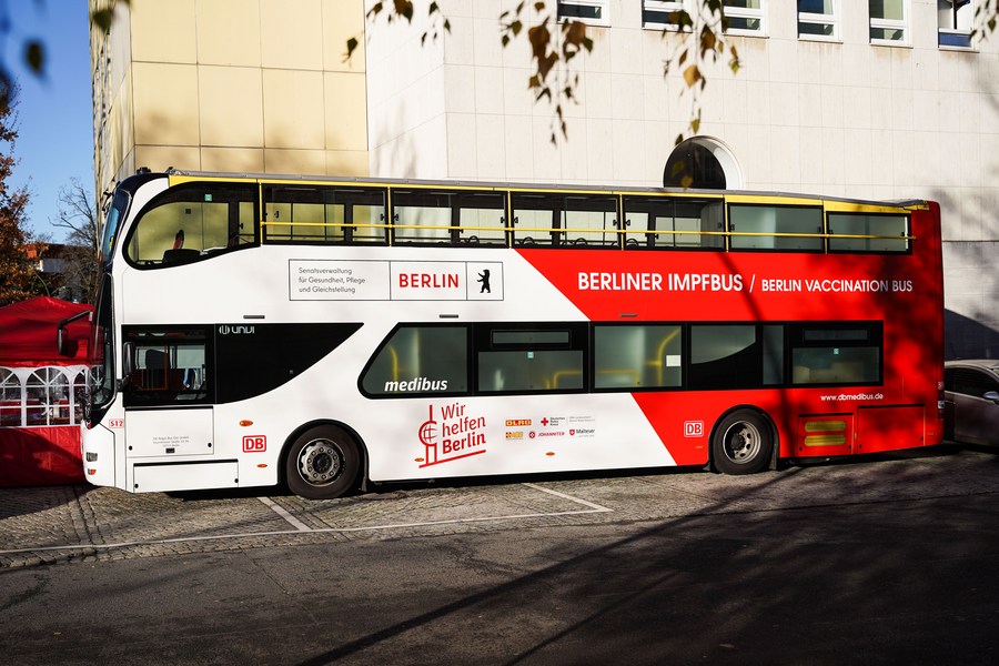 Photo taken on Nov. 22, 2021 shows a vaccination bus in Berlin, capital of Germany. (Photo by Stefan Zeitz/Xinhua)