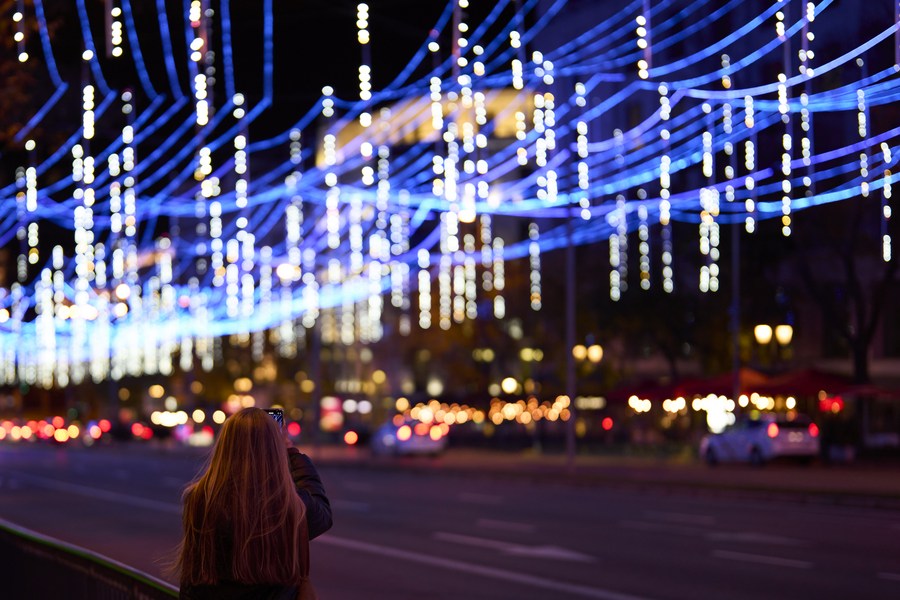A woman takes photos on a street decorated with festive lights for Christmas in Madrid, capital of Spain, Dec. 2, 2021. (Xinhua/Meng Dingbo)
