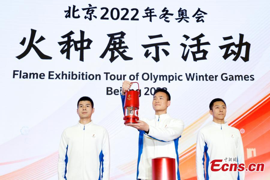 The Olympic flame for Beijing 2022 Winter Games is presented by staff at Beijing Expo Park, Dec 29, 2021. (China News Service/Han Haidan)