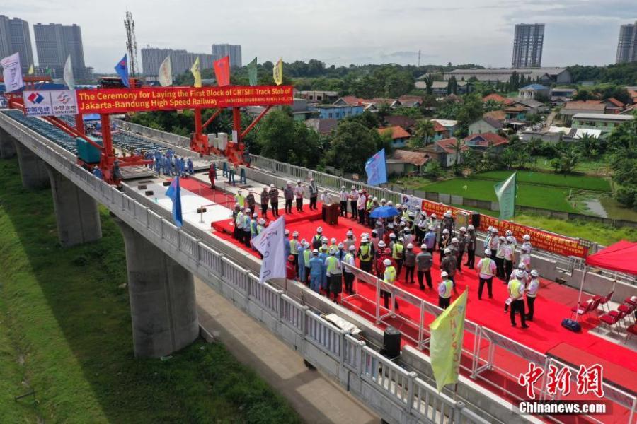 Photo taken on Dec 29, 2021 shows the ceremony of laying Chinese-developed CRTS III ballastless track slabs on the Jakarta-Bandung high-speed railway (HSR) in Indonesia. (China News Service/Tao Yuanyu)