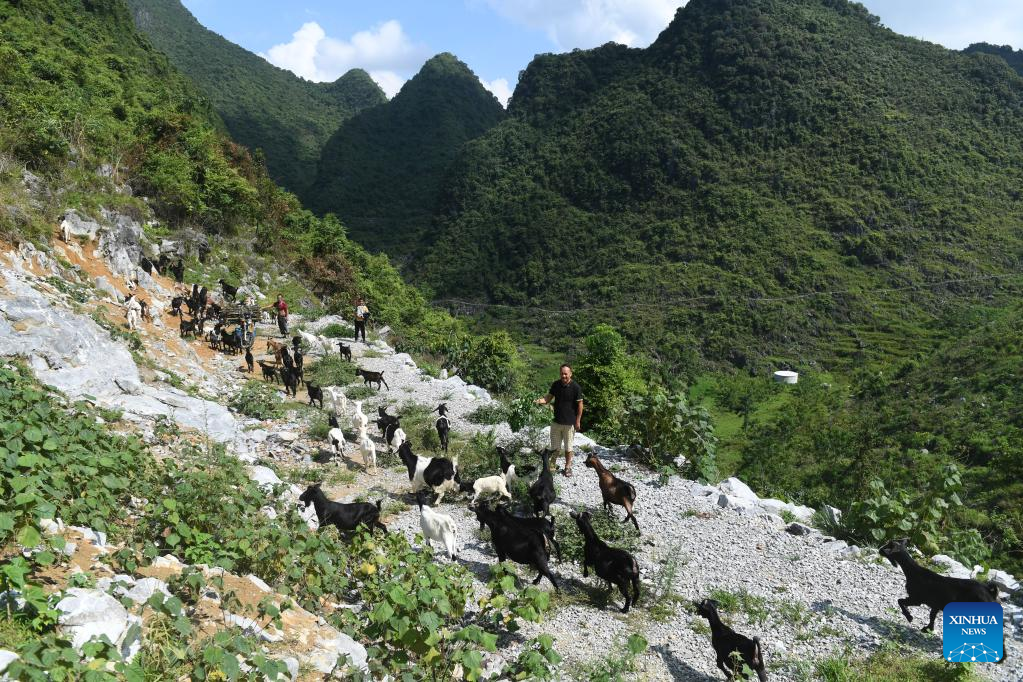 A villager herds goats at Chihua Village of Du'an Yao Autonomous County, south China's Guangxi Zhuang Autonomous Region, Sept. 3, 2021. As Guangxi consolidates its achievements in poverty alleviation and goes all out for rural revitalization, fostering rural industries is of great significance of advancing income growth of rural residents. (Xinhua/Lu Boan)
