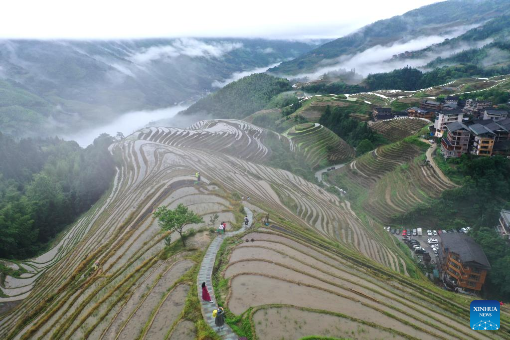 Aerial photo taken on May 21, 2021 shows Heping Village of Guilin, where tourist industry is developed well, south China's Guangxi Zhuang Autonomous Region. As Guangxi consolidates its achievements in poverty alleviation and goes all out for rural revitalization, fostering rural industries is of great significance of advancing income growth of rural residents. (Xinhua/Zhou Hua)
