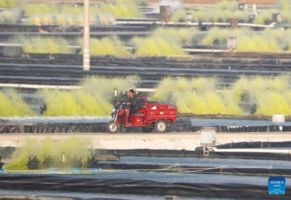 A villager transports goods at a marine microalgae breeding base in Shanxin Village of Fangchenggang City, south China's Guangxi Zhuang Autonomous Region, Dec. 17, 2021. As Guangxi consolidates its achievements in poverty alleviation and goes all out for rural revitalization, fostering rural industries is of great significance of advancing income growth of rural residents. (Xinhua/Zhou Hua)