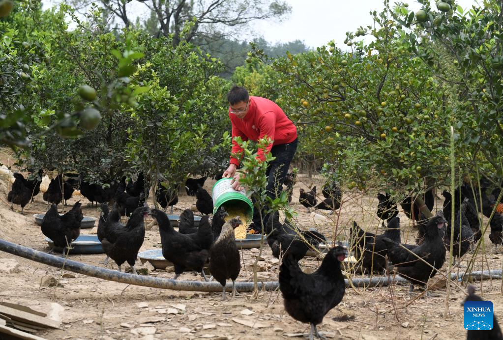 A villager feeds chicken at Zhengyi Village of Lingchuan County, south China's Guangxi Zhuang Autonomous Region, Oct. 27, 2021. As Guangxi consolidates its achievements in poverty alleviation and goes all out for rural revitalization, fostering rural industries is of great significance of advancing income growth of rural residents. (Xinhua/Lu Boan)
