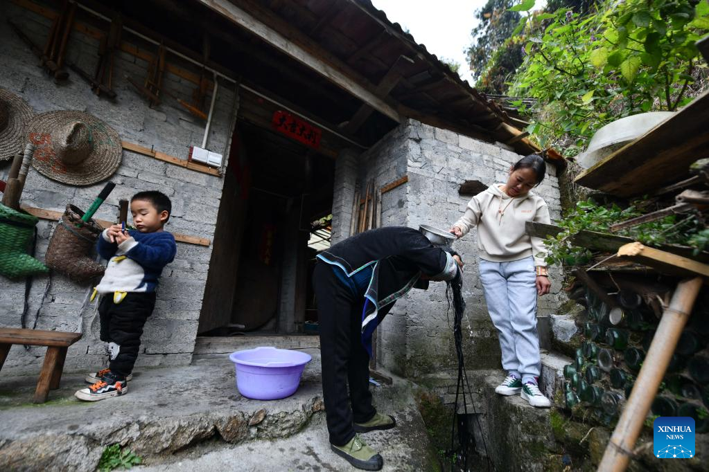 Liang Yuanhua (R) helps her mother Liang Yingmi wash hair in Wuying Village on the border between south China's Guangxi Zhuang Autonomous Region and southwest China's Guizhou Province, on Dec. 11, 2021.