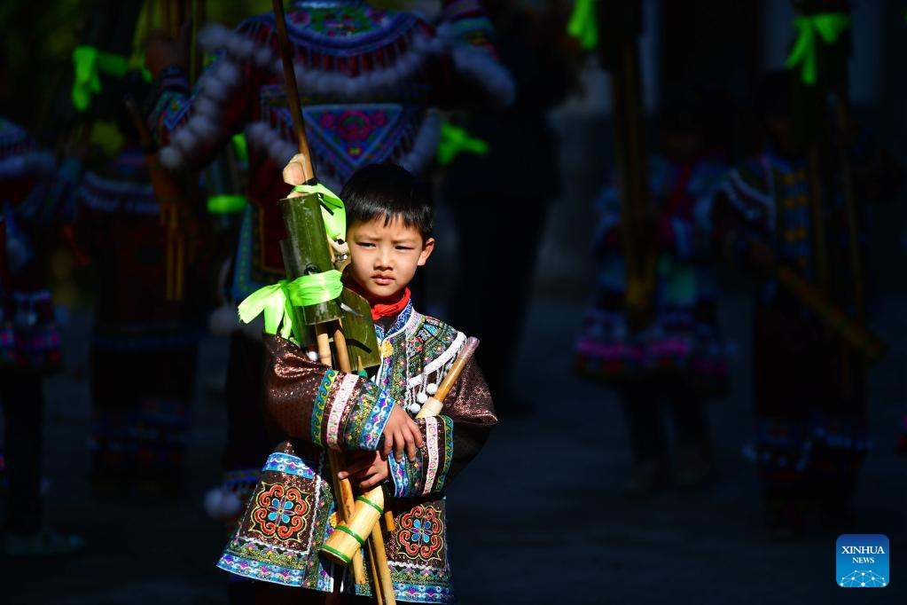 Student Wu Liangyou holds a Lusheng, a reed-pipe wind instrument, before having a class at the teaching point of Wuying Village on the border between south China's Guangxi Zhuang Autonomous Region and southwest China's Guizhou Province, on Nov. 25, 2021.