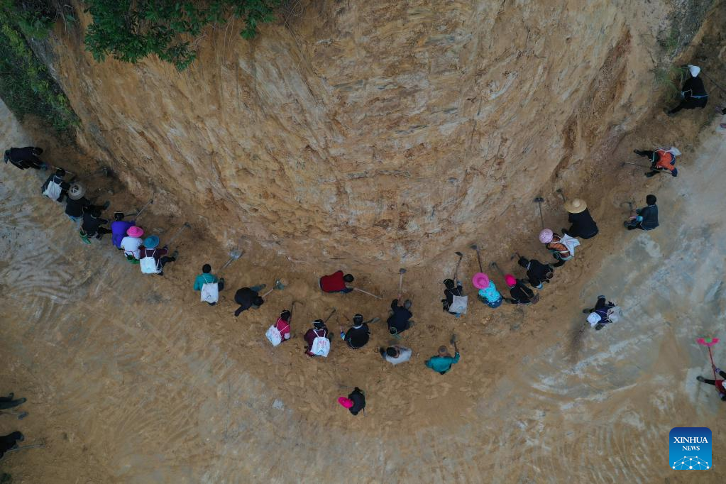 Aerial photo taken on Oct. 28, 2021 shows villagers mending a road in Wuying Village on the border between south China's Guangxi Zhuang Autonomous Region and southwest China's Guizhou Province.