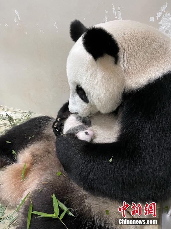 Photo taken on Sept 5, 2021 shows the giant panda cub Le Le taken good care by his mother Jia Jia in Singapore. (File photo/China News Service)
