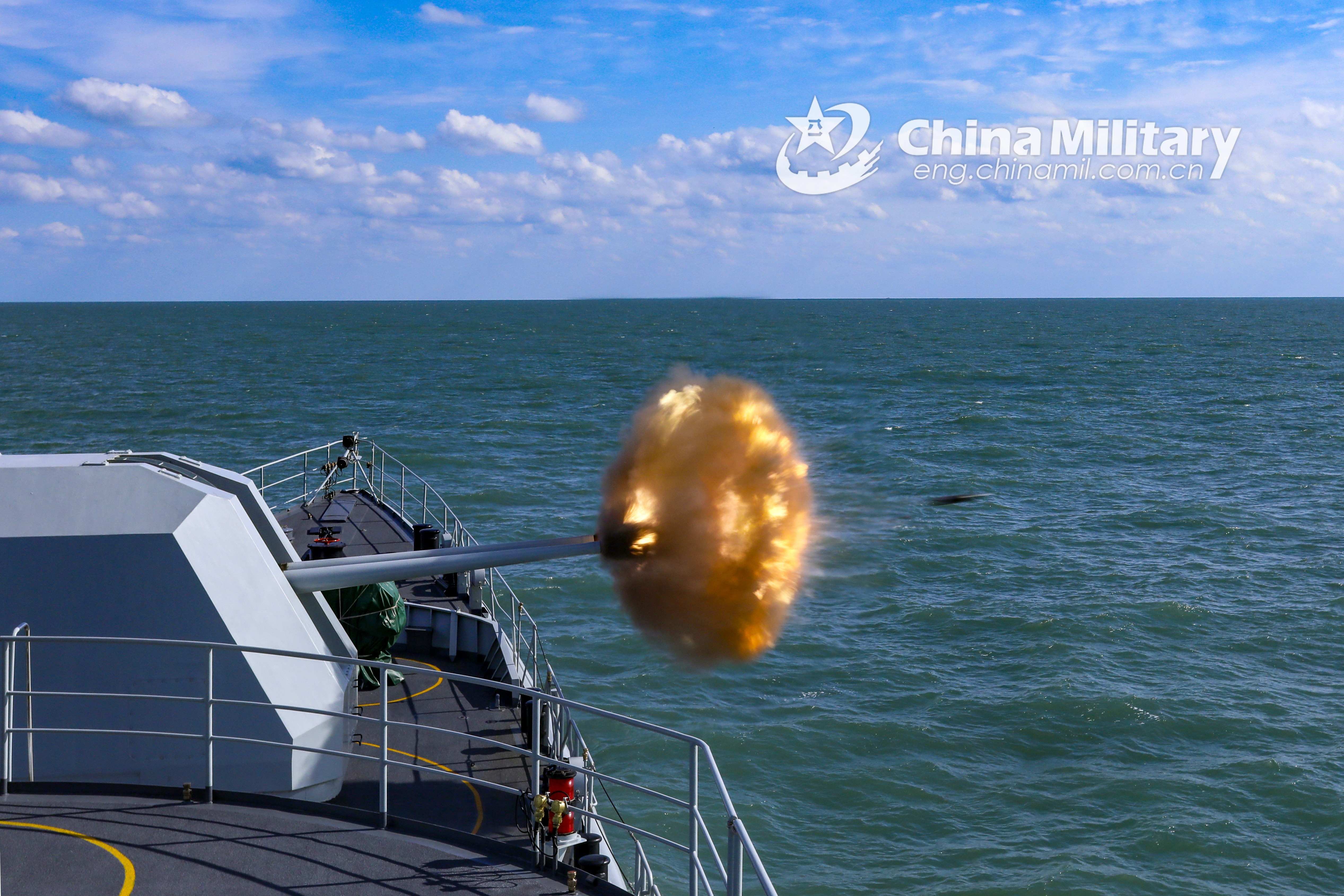 A vessel attached to a frigate flotilla with the navy under the PLA Eastern Theater Command fires its main gun against onshore targets during a maritime live-fire training exercise in early December, 2021. (eng.chinamil.com.cn/Photo by Liu Min)