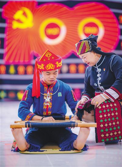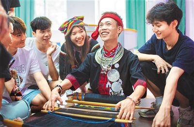 Photo shows Huang Yangwei learning Li Brocade textile techniques from a state-level inheritor of the traditional craft. (Photo/Hainan Daily)
