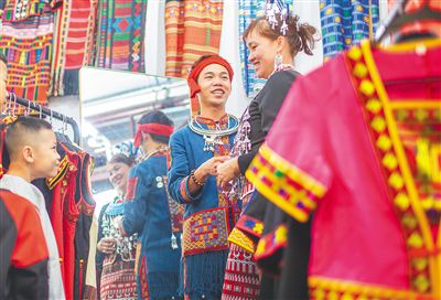 Huang Yangwei helps a customer choose costumes from the Yi ethnic group at his shop. (Photo/Hainan Daily)