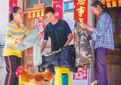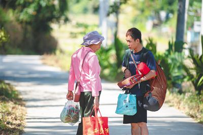 Huang Yangwei’s mother and aunt help him pack his clothes before he makes a move to the urban area of Wuzhishan city, Hainan. (Photo/Hainan Daily)