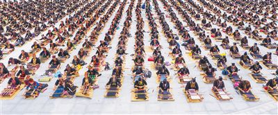 Photo taken on Oct. 16, 2021, shows Huang Yangwei (second from the left in the first row) working on a Li Brocade product together with over 1,000 female weavers of the Li ethnic group at a square in Dongfang city, Hainan. (Photo/Hainan Daily)