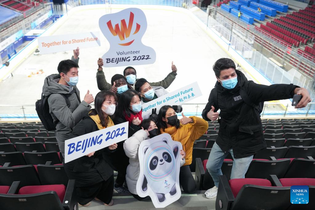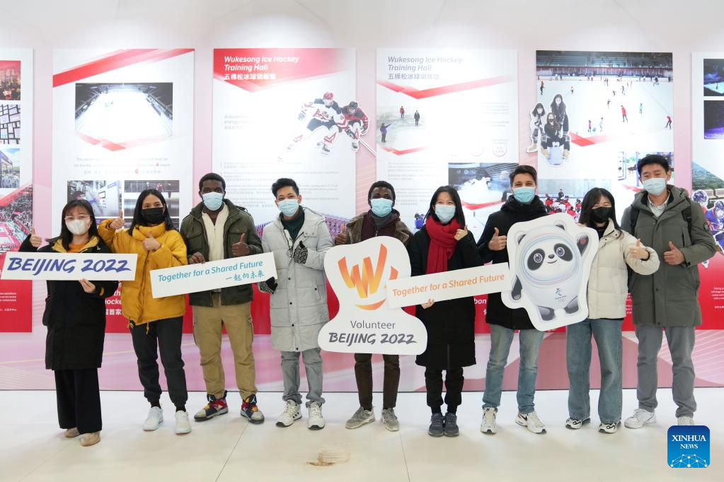 Foreign volunteers from University of Science and Technology Beijing pose for photos at Wukesong Sports Center in Beijing, capital of China, Dec. 30, 2021. The first batch of volunteers entered Wukesong Sports Center to participate in a training program ahead of Beijing 2022 Winter Olympic Games. The training program aims to help volunteers get familiar with all kinds of regularities of the venue operation team and the flows and positions of different areas in the venue. All 660 volunteers of Wukesong Sports Center divided in 6 batches will complete the training program before Jan. 15, 2022. (Xinhua/Ju Huanzong)