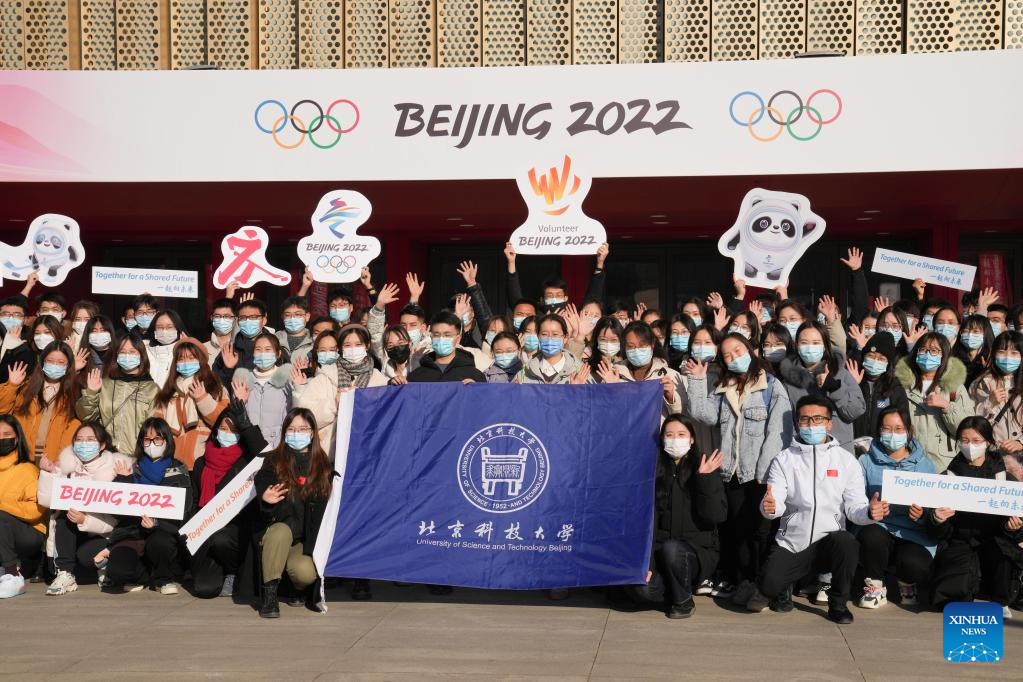 Volunteers from University of Science and Technology Beijing take group photos at Wukesong Sports Center in Beijing, capital of China, Dec. 30, 2021. The first batch of volunteers entered Wukesong Sports Center to participate in a training program ahead of Beijing 2022 Winter Olympic Games. The training program aims to help volunteers get familiar with all kinds of regularities of the venue operation team and the flows and positions of different areas in the venue. All 660 volunteers of Wukesong Sports Center divided in 6 batches will complete the training program before Jan. 15, 2022. (Xinhua/Ju Huanzong)
