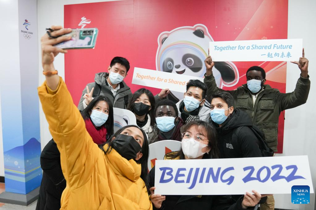 Volunteer Taechinee Prasnakorn (front L) from Thailand and other foreign volunteers from University of Science and Technology Beijing take selfies at Wukesong Sports Center in Beijing, capital of China, Dec. 30, 2021. The first batch of volunteers entered Wukesong Sports Center to participate in a training program ahead of Beijing 2022 Winter Olympic Games. The training program aims to help volunteers get familiar with all kinds of regularities of the venue operation team and the flows and positions of different areas in the venue. All 660 volunteers of Wukesong Sports Center divided in 6 batches will complete the training program before Jan. 15, 2022. (Xinhua/Ju Huanzong)