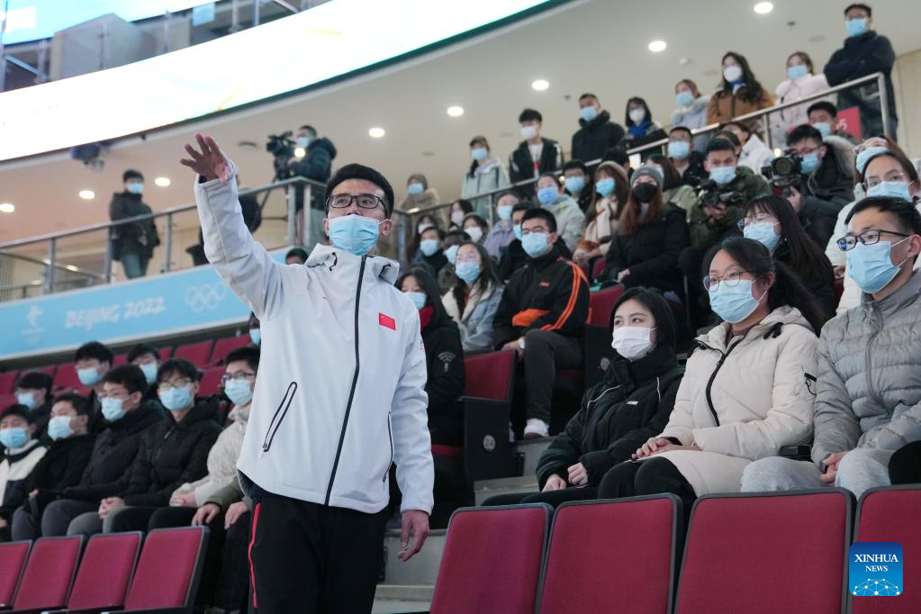 Volunteer manager Chen Dapeng (front) speaks during the training program at Wukesong Sports Center in Beijing, capital of China, Dec. 30, 2021. The first batch of volunteers entered Wukesong Sports Center to participate in a training program ahead of Beijing 2022 Winter Olympic Games. The training program aims to help volunteers get familiar with all kinds of regularities of the venue operation team and the flows and positions of different areas in the venue. All 660 volunteers of Wukesong Sports Center divided in 6 batches will complete the training program before Jan. 15, 2022. (Xinhua/Ju Huanzong)