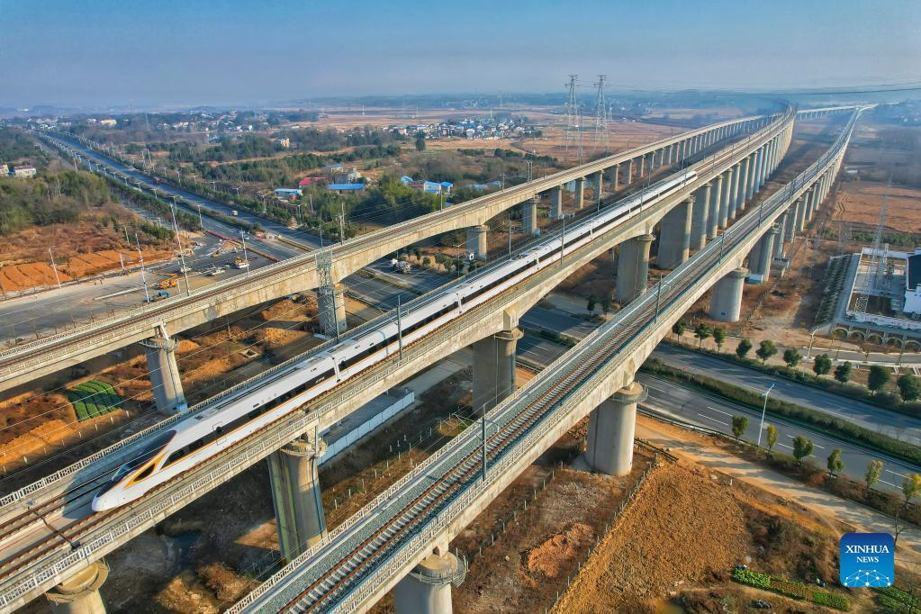 Aerial photo taken on Dec. 30, 2021 shows a train running along the Anqing-Jiujiang high-speed railway in Huaining County, east China's Anhui Province. A new high-speed railway section linking Anqing City in east China's Anhui Province, with Jiujiang City in east China's Jiangxi Province began operation Thursday. The 176-km line, with seven stations along its route, will reduce travel time between Anhui's capital Hefei and Jiangxi's capital Nanchang to two hours and 22 minutes, according to China Railway Shanghai Group Co., Ltd. The Anqing-Jiujiang high-speed railway has a designed speed of 350 km per hour and is connected to China's vertical artery of the Beijing-Hong Kong Railway. (Photo by Jiang Sheng/Xinhua)