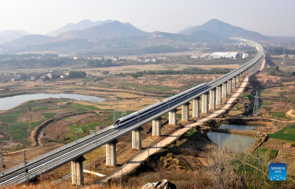 A train runs along the Anqing-Jiujiang high-speed railway in Susong County, east China's Anhui Province, Dec. 30, 2021. A new high-speed railway section linking Anqing City in east China's Anhui Province, with Jiujiang City in east China's Jiangxi Province began operation Thursday. The 176-km line, with seven stations along its route, will reduce travel time between Anhui's capital Hefei and Jiangxi's capital Nanchang to two hours and 22 minutes, according to China Railway Shanghai Group Co., Ltd. The Anqing-Jiujiang high-speed railway has a designed speed of 350 km per hour and is connected to China's vertical artery of the Beijing-Hong Kong Railway. (Photo by Lyu Jinyi/Xinhua)