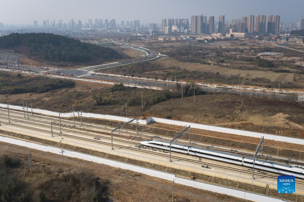 Aerial photo taken on Dec. 30, 2021 shows a train running along the Anqing-Jiujiang high-speed railway in Huangmei County, central China's Hubei Province. A new high-speed railway section linking Anqing City in east China's Anhui Province, with Jiujiang City in east China's Jiangxi Province began operation Thursday. The 176-km line, with seven stations along its route, will reduce travel time between Anhui's capital Hefei and Jiangxi's capital Nanchang to two hours and 22 minutes, according to China Railway Shanghai Group Co., Ltd. The Anqing-Jiujiang high-speed railway has a designed speed of 350 km per hour and is connected to China's vertical artery of the Beijing-Hong Kong Railway. (Xinhua/Xiao Yijiu)