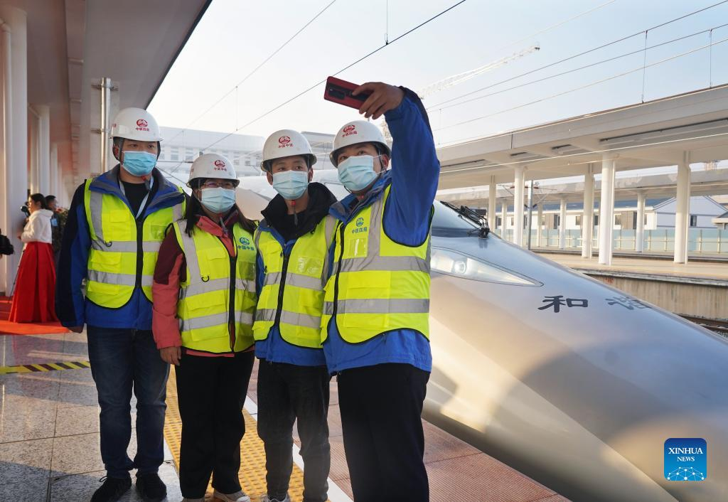 (211230) -- JIUJIANG, Dec. 30, 2021 (Xinhua) -- Construction workers of the Anqing-Jiujiang high-speed railway pose for a photo at the Lushan Station in east China's Jiangxi Province, Dec. 30, 2021. A new high-speed railway section linking Anqing City in east China's Anhui Province, with Jiujiang City in east China's Jiangxi Province began operation Thursday. The 176-km line, with seven stations along its route, will reduce travel time between Anhui's capital Hefei and Jiangxi's capital Nanchang to two hours and 22 minutes, according to China Railway Shanghai Group Co., Ltd. The Anqing-Jiujiang high-speed railway has a designed speed of 350 km per hour and is connected to China's vertical artery of the Beijing-Hong Kong Railway. (Xinhua/Wan Xiang)