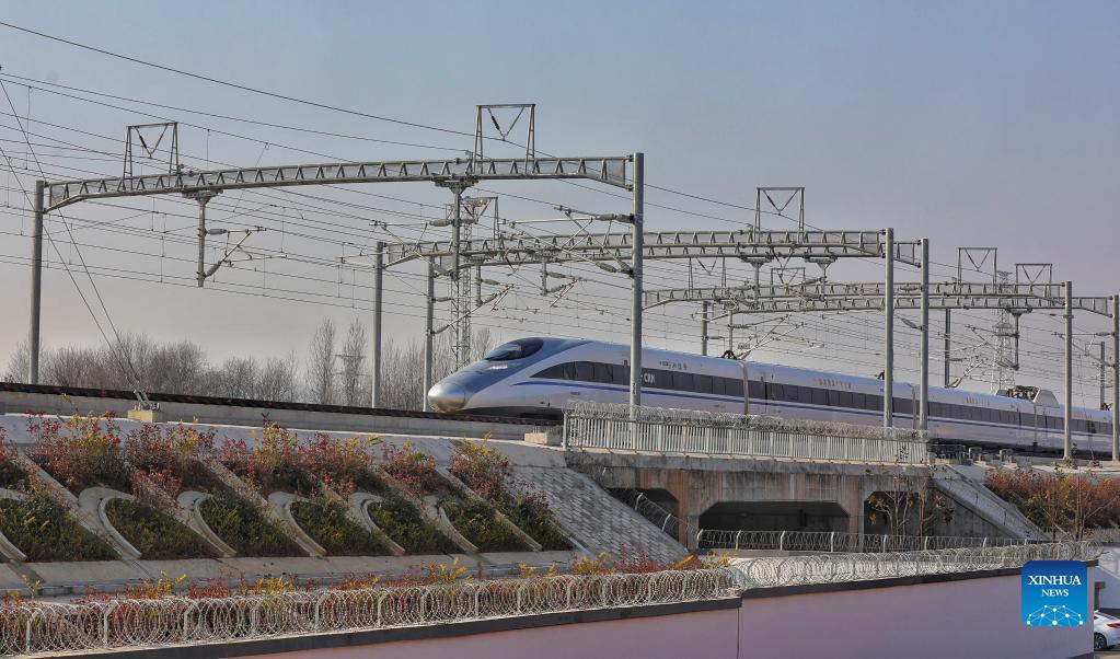 A train runs along the Anqing-Jiujiang high-speed railway in Huaining County, east China's Anhui Province, Dec. 30, 2021. A new high-speed railway section linking Anqing City in east China's Anhui Province, with Jiujiang City in east China's Jiangxi Province began operation Thursday. The 176-km line, with seven stations along its route, will reduce travel time between Anhui's capital Hefei and Jiangxi's capital Nanchang to two hours and 22 minutes, according to China Railway Shanghai Group Co., Ltd. The Anqing-Jiujiang high-speed railway has a designed speed of 350 km per hour and is connected to China's vertical artery of the Beijing-Hong Kong Railway. (Photo by Jiang Sheng/Xinhua)
