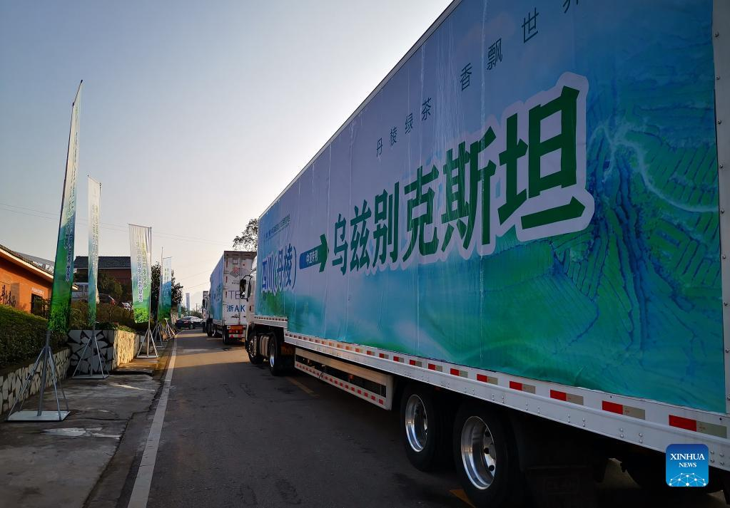 Green tea are loaded to export for Uzbekistan at Danling County, southwest China's Sichuan Province, Dec. 29, 2021. (Xinhua/Chen Jian)