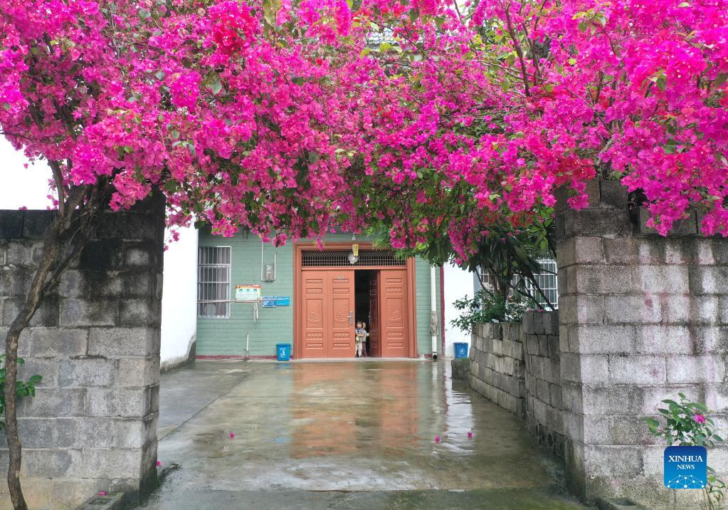 A yard with blooming flowers is pictured in Dingye Village of Wucun Township in Baise City, south China's Guangxi Zhuang Autonomous Region, April 7, 2021. In 2021, Guangxi Zhuang Autonomous Region has made great efforts to accelerate improvement of rural living environment amid the bid to promote rural vitalization and upgrade the living conditions of rural residents. (Xinhua/Zhou Hua)
