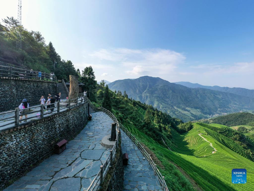 Tourists view the scenery of terraced fields in Ping'an Village of Longji Township in Longsheng County, south China's Guangxi Zhuang Autonomous Region, July 28, 2021. In 2021, Guangxi Zhuang Autonomous Region has made great efforts to accelerate improvement of rural living environment amid the bid to promote rural vitalization and upgrade the living conditions of rural residents. (Xinhua/Cao Yiming)
