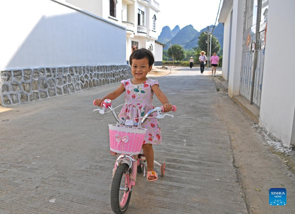 A girl rides a child's cycle in Laoya Village of Zhangjia Township in Pingle County, south China's Guangxi Zhuang Autonomous Region, July 15, 2021. In 2021, Guangxi Zhuang Autonomous Region has made great efforts to accelerate improvement of rural living environment amid the bid to promote rural vitalization and upgrade the living conditions of rural residents. (Xinhua/Zhou Hua)
