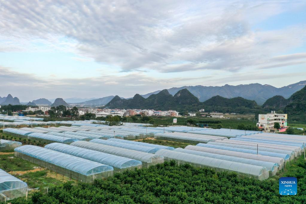 Aerial photo taken on Nov. 23, 2021 shows a vegetable and fruit planting base in Tongling Town of Wuxuan County in south China's Guangxi Zhuang Autonomous Region. In 2021, Guangxi Zhuang Autonomous Region has made great efforts to accelerate improvement of rural living environment amid the bid to promote rural vitalization and upgrade the living conditions of rural residents. (Xinhua/Cao Yiming)