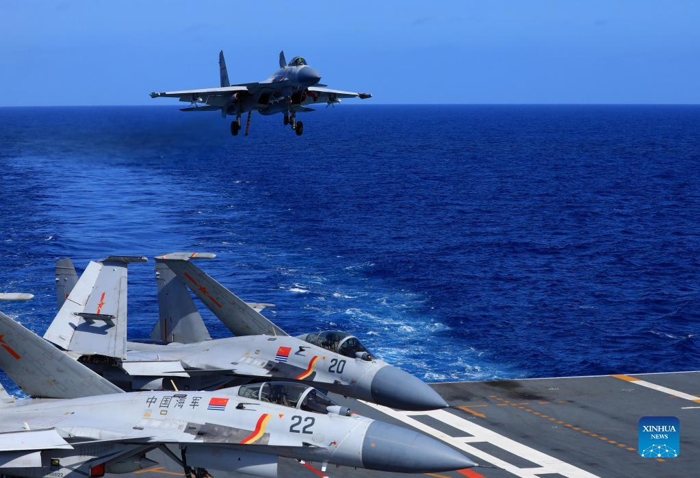 Undated file photo shows a carrier-based J-15 fighter jet preparing to land during open-sea combat training. The Chinese navy's Liaoning aircraft-carrier formation returned on Dec. 30, 2021 to a military port in Qingdao, east China's Shandong Province, concluding 20-plus days of open-sea combat training. The exercise, which began on Dec. 9, took the formation into various waters, from the Yellow Sea to the East China Sea and the West Pacific, and has improved the formation's combat capability, according to an official statement. (Photo by Hu Shanmin/Xinhua)